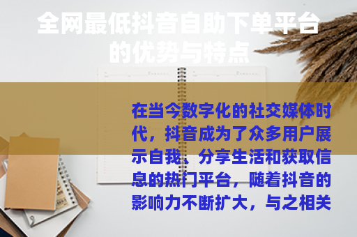 在当今数字化的社交媒体时代,抖音成为了众多用户展示自我、分享生活和获取信息的热门平台,随着抖音的影响力不断扩大,与之相关的各种服务和平台也应运而生,其中全网最低抖音自助下单平台备受关注。