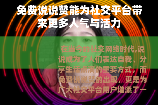 免费说说赞在社交网络中扮演着重要的角色,它为用户带来了快乐和满足感,为社交平台营造了活跃的氛围,为企业提供了推广的机会,也促进了社交公平和信息流通,只要我们能够合理地利用它,并不断完善相关的管理和引导机制,相信免费说说赞将会在社交网络的发展中发挥更大的作用,为我们的社交生活增添更多的色彩和价值,它就像一把钥匙,打开了社交平台上更多互动和交流的大门,让我们在虚拟的网络世界里也能感受到温暖和关怀,让我们的社交体验更加丰富和美好,让我们珍惜免费说说赞带来的积极影响,共同营造一个健康、和谐、充满活力的社交网络环境。
