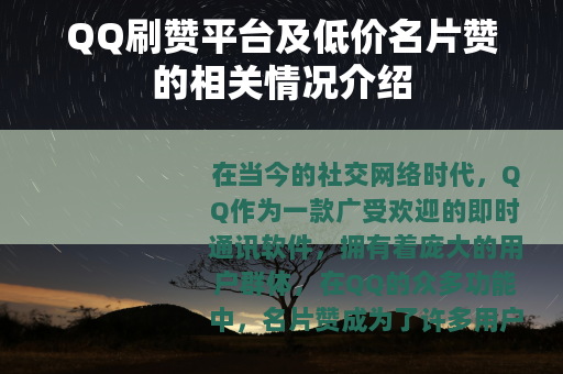 在当今的社交网络时代,QQ作为一款广受欢迎的即时通讯软件,拥有着庞大的用户群体,在QQ的众多功能中,名片赞成为了许多用户关注的一个方面,为了满足用户对于名片赞数量的需求,市场上出现了各种各样的QQ刷赞平台,其中低价名片赞更是吸引了不少人的目光。