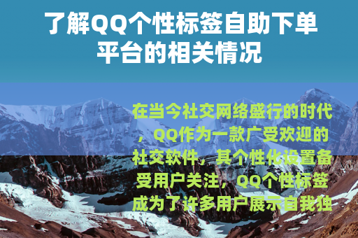 在当今社交网络盛行的时代,QQ作为一款广受欢迎的社交软件,其个性化设置备受用户关注,QQ个性标签成为了许多用户展示自我独特风格和个性的重要方式,而随着需求的增长,QQ个性标签自助下单平台也应运而生。