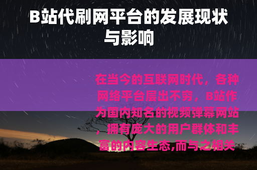 在当今的互联网时代,各种网络平台层出不穷,B站作为国内知名的视频弹幕网站,拥有庞大的用户群体和丰富的内容生态,而与之相关的B站代刷网平台也在一定程度上悄然兴起。