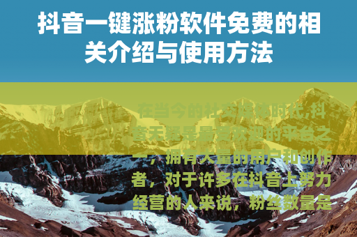 在当今的社交媒体时代,抖音无疑是最受欢迎的平台之一,拥有大量的用户和创作者,对于许多在抖音上努力经营的人来说,粉丝数量是衡量成功的一个重要指标,抖音一键涨粉软件免费的出现,引起了不少人的关注。