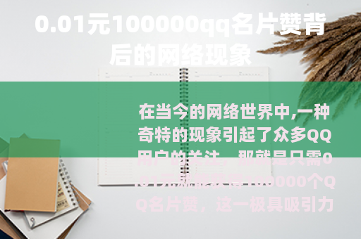 在当今的网络世界中,一种奇特的现象引起了众多QQ用户的关注,那就是只需0.01元就能获得100000个QQ名片赞,这一极具吸引力的交易在网络的某些角落悄然兴起,成为了不少人热议的话题。