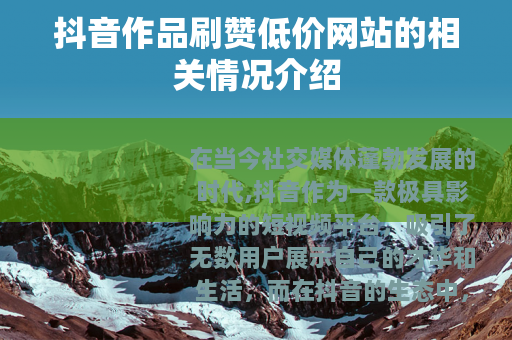 在当今社交媒体蓬勃发展的时代,抖音作为一款极具影响力的短视频平台,吸引了无数用户展示自己的才华和生活,而在抖音的生态中,作品的点赞数往往被视为衡量其受欢迎程度的重要指标之一,一些所谓的抖音作品刷赞低价网站便应运而生。