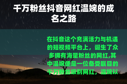 在抖音这个充满活力与机遇的短视频平台上,诞生了众多拥有海量粉丝的网红,其中温婉便是一位备受瞩目的千万粉丝级别网红。