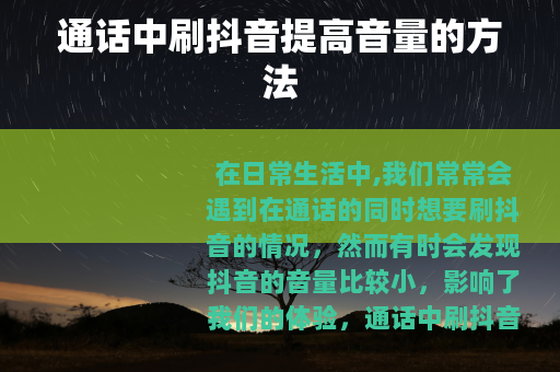 在日常生活中,我们常常会遇到在通话的同时想要刷抖音的情况,然而有时会发现抖音的音量比较小,影响了我们的体验,通话中刷抖音怎么提高音量呢?