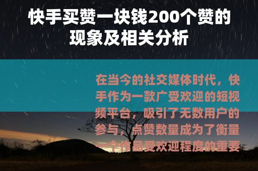 在当今的社交媒体时代,快手作为一款广受欢迎的短视频平台,吸引了无数用户的参与,点赞数量成为了衡量一个作品受欢迎程度的重要指标之一,而市场上出现了一种现象,即声称快手买赞一块钱200个赞在线的服务。