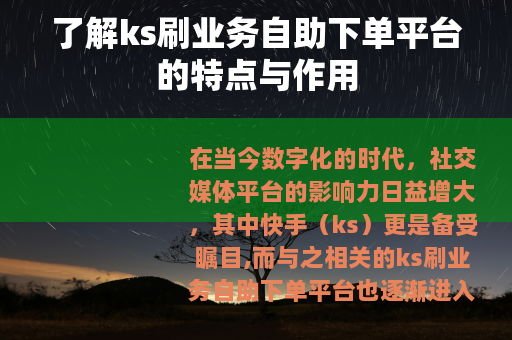 在当今数字化的时代,社交媒体平台的影响力日益增大,其中快手(ks)更是备受瞩目,而与之相关的ks刷业务自助下单平台也逐渐进入了人们的视野。