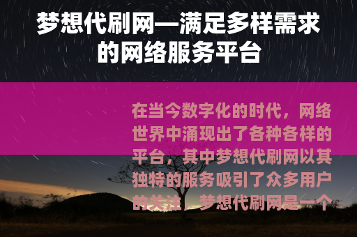 在当今数字化的时代,网络世界中涌现出了各种各样的平台,其中梦想代刷网以其独特的服务吸引了众多用户的关注,梦想代刷网是一个致力于为用户提供多元化网络服务的站点,它在互联网的大舞台上逐渐崭露头角。