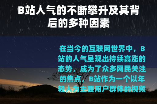 在当今的互联网世界中,B站的人气呈现出持续高涨的态势,成为了众多网民关注的焦点,B站作为一个以年轻人为主要用户群体的视频弹幕网站,其独特的文化氛围和丰富的内容吸引了大量的用户,从而造就了其令人瞩目的人气。