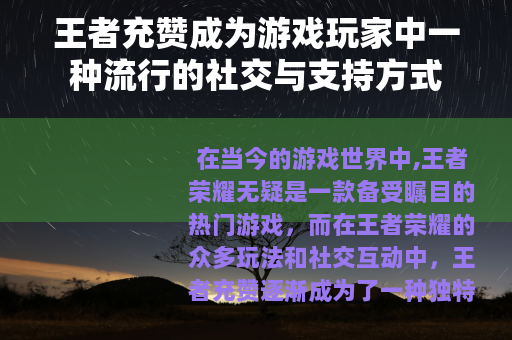 在当今的游戏世界中,王者荣耀无疑是一款备受瞩目的热门游戏,而在王者荣耀的众多玩法和社交互动中,王者充赞逐渐成为了一种独特的现象,为玩家们带来了别样的游戏体验。