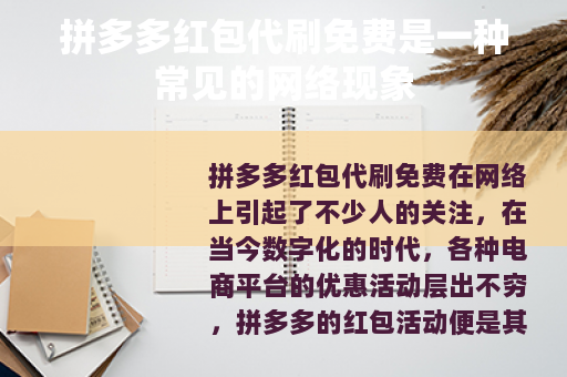 拼多多红包代刷免费在网络上引起了不少人的关注,在当今数字化的时代,各种电商平台的优惠活动层出不穷,拼多多的红包活动便是其中之一,许多用户都希望能够通过各种方式获取更多的红包,从而在购物时享受更多的实惠,而拼多多红包代刷免费的信息也就在这样的背景下应运而生。