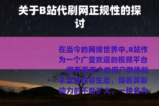 在当今的网络世界中,B站作为一个广受欢迎的视频平台,拥有着庞大的用户群体和丰富的内容生态,随着其影响力的不断扩大,一种名为“B站代刷网”的现象也逐渐进入了人们的视野。