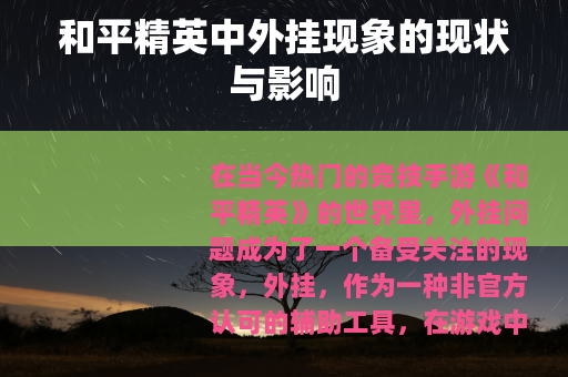 在当今热门的竞技手游《和平精英》的世界里,外挂问题成为了一个备受关注的现象,外挂,作为一种非官方认可的辅助工具,在游戏中悄然滋生并逐渐影响着游戏的生态和玩家的体验。