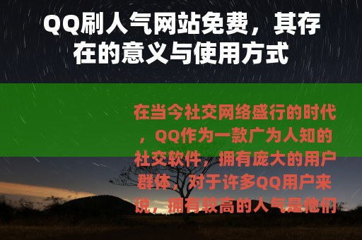 在当今社交网络盛行的时代,QQ作为一款广为人知的社交软件,拥有庞大的用户群体,对于许多QQ用户来说,拥有较高的人气是他们所期望的,这不仅能让自己在社交圈子中更受关注,也能在一定程度上满足自己的社交需求,而QQ刷人气网站免费的出现,就为这些用户提供了一种可能的途径。