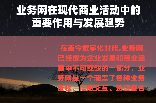 在未来,业务网将继续朝着更加智能化、集成化和开放化的方向发展,企业需要不断加强自身的信息化建设,提升业务网的运营管理水平,以适应市场的变化和竞争的需求,企业还应积极探索与其他企业、行业组织以及政府部门之间的合作,共同构建更加完善的业务生态系统,实现资源共享、优势互补,推动产业的升级和创新发展,业务网作为现代商业活动的重要基础设施,将在企业的发展和经济的增长中发挥越来越重要的作用,企业只有充分认识到其价值并善于运用,才能在激烈的市场竞争中立于不败之地。