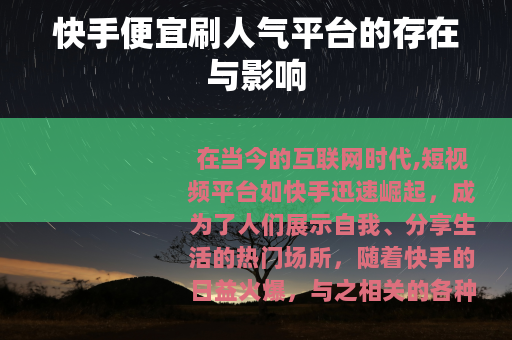 在当今的互联网时代,短视频平台如快手迅速崛起,成为了人们展示自我、分享生活的热门场所,随着快手的日益火爆,与之相关的各种产业也应运而生,其中就包括一些声称可以提供便宜刷人气服务的平台。