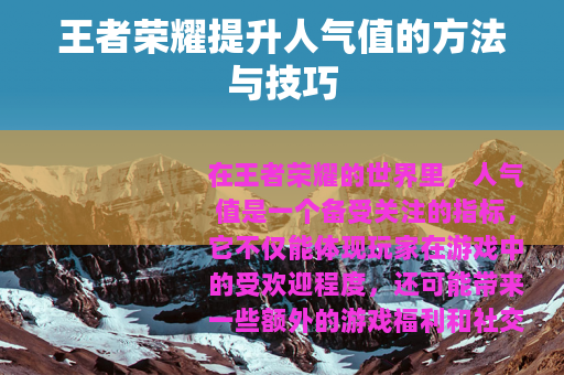 在王者荣耀的世界里,人气值是一个备受关注的指标,它不仅能体现玩家在游戏中的受欢迎程度,还可能带来一些额外的游戏福利和社交优势,王者荣耀的人气值究竟该怎么弄呢?以下是一些有效的方法和技巧。