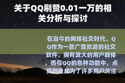 在当今的网络社交时代,QQ作为一款广受欢迎的社交软件,拥有庞大的用户群体,而在QQ的各种功能中,点赞数量成为了许多用户关注的一个方面,QQ刷赞0.01一万这样的现象逐渐进入了人们的视野。