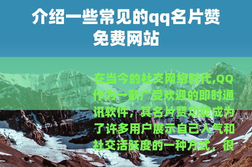 在当今的社交网络时代,QQ作为一款广受欢迎的即时通讯软件,其名片赞功能成为了许多用户展示自己人气和社交活跃度的一种方式,很多人都希望能够获得更多的名片赞,而免费的qq名片赞网站也应运而生,为广大QQ用户提供了一种增加名片赞数量的途径。