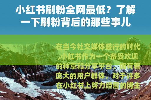 在当今社交媒体盛行的时代,小红书作为一个备受欢迎的种草和分享平台,拥有着庞大的用户群体,对于许多在小红书上努力经营的博主和商家来说,粉丝数量似乎成为了衡量成功的一个重要标准。“小红书刷粉全网最低”这样的宣传语便应运而生,吸引了不少人的目光。