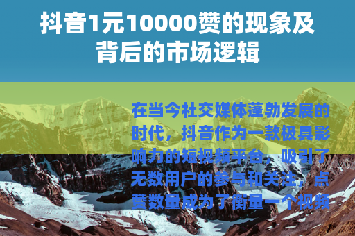 在当今社交媒体蓬勃发展的时代,抖音作为一款极具影响力的短视频平台,吸引了无数用户的参与和关注,点赞数量成为了衡量一个视频受欢迎程度的重要指标之一,而在这个过程中,出现了一种引人注目的现象,那就是所谓的抖音1元10000赞的服务。