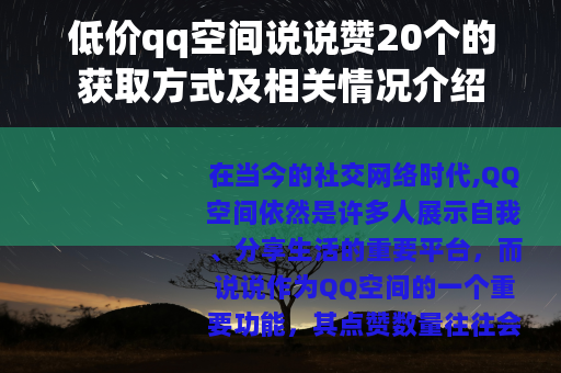 当我们在网络上搜索相关信息时,会发现有不少平台或个人提供低价qq空间说说赞的业务,这些服务通常以非常实惠的价格吸引着用户,比如只需花费很少的钱,就可以轻松获得20个说说赞,对于一些希望自己的说说能够快速获得较高关注度的用户来说,这无疑是一个极具吸引力的选择。