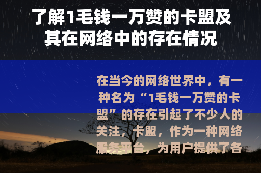 在当今的网络世界中,有一种名为“1毛钱一万赞的卡盟”的存在引起了不少人的关注,卡盟,作为一种网络服务平台,为用户提供了各种各样的虚拟商品和服务交易,而其中“1毛钱一万赞”的这种服务,更是以其极低的价格吸引了众多想要在网络平台上快速提升自己账号热度的用户。