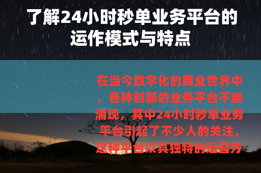 在当今数字化的商业世界中,各种创新的业务平台不断涌现,其中24小时秒单业务平台引起了不少人的关注,这种平台以其独特的运营方式和服务承诺,在特定的商业领域中占据了一席之地。