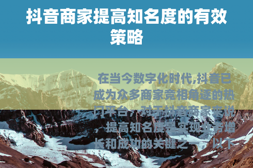 在当今数字化时代,抖音已成为众多商家竞相角逐的热门平台,对于抖音商家来说,提高知名度是实现业务增长和成功的关键之一,以下是一些可以帮助抖音商家提高知名度的有效方法。 的创作至关重要,商家需要深入了解自己的目标受众,明确他们的兴趣和需求,从而制作出能够吸引他们的视频内容,无论是有趣的短剧、实用的教程还是精美的产品展示,都要确保内容具有独特性和价值,能够在海量的抖音视频中脱颖而出,一家服装商家可以通过展示不同风格的服装搭配,以及分享穿搭技巧,吸引时尚爱好者的关注。