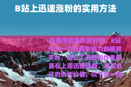 在当今的互联网时代,B站作为一个极具影响力的视频平台,吸引了无数创作者想要在上面迅速涨粉,实现自己的创作价值,以下是一些在B站上能够帮助你快速涨粉的有效方法。 质量是关键,你需要提供有价值、有趣且独特的视频内容,无论是知识分享、搞笑娱乐、生活记录还是才艺展示,都要确保你的视频能够吸引观众的眼球并让他们产生共鸣,在制作视频时,要注重画面的清晰度和稳定性,以及声音的清晰可听,合理安排视频的节奏,避免过于拖沓或节奏过快让观众难以跟上。