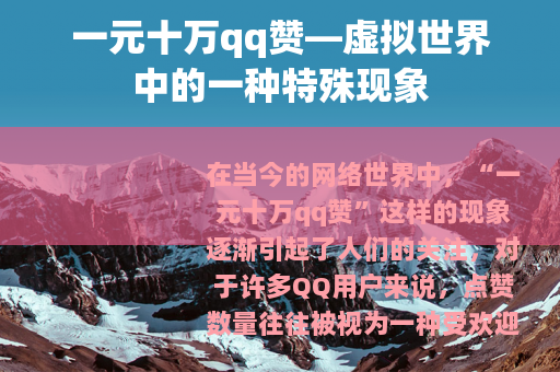 在当今的网络世界中,“一元十万qq赞”这样的现象逐渐引起了人们的关注,对于许多QQ用户来说,点赞数量往往被视为一种受欢迎程度和影响力的象征,而“一元十万qq赞”的出现,无疑为那些渴望快速提升自己QQ空间或说说点赞数的人提供了一种看似便捷的途径。
