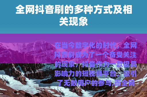 在当今数字化的时代,全网抖音刷成为了一个备受关注的现象,抖音作为一款极具影响力的短视频平台,吸引了无数用户的参与,而全网抖音刷也随之兴起。