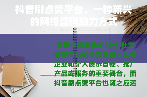 抖音刷点赞平台是数字时代社交媒体营销领域的一个新现象,它既有其积极的一面,也需要用户谨慎使用,只有在正确的引导和规范下,它才能更好地为用户服务,为抖音平台的发展注入新的活力,推动整个社交媒体行业不断向前迈进,我们应该以开放和理性的态度看待它的存在和发展,充分发挥其优势,同时避免可能出现的问题,让抖音刷点赞平台在合法合规的轨道上为我们创造更多的价值。