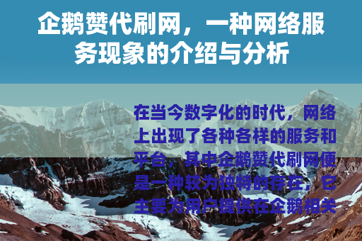 企鹅赞代刷网在网络社交领域中具有一定的影响力和作用,它既带来了机遇,也带来了挑战,我们需要以客观、理性的态度去看待它,引导其朝着健康、有序的方向发展,让它在满足用户需求的同时,也能够维护网络社交的良好生态,为网络社交的发展做出积极的贡献,我们才能在数字化的时代,充分利用好各种网络服务和工具,实现个人和社会的共同发展与进步。