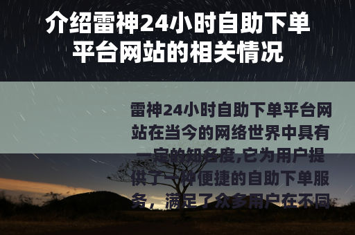 雷神24小时自助下单平台网站在当今的网络世界中具有一定的知名度,它为用户提供了一种便捷的自助下单服务,满足了众多用户在不同需求方面的交易需求。