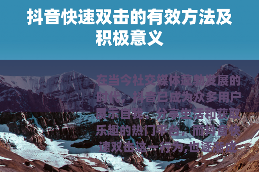 在当今社交媒体蓬勃发展的时代,抖音已成为众多用户展示自我、分享生活和获取乐趣的热门平台,而抖音快速双击这一行为,也逐渐成为了用户们关注的一个重要方面。