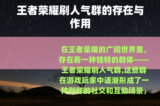 在王者荣耀的广阔世界里,存在着一种独特的群体——王者荣耀刷人气群,这些群在游戏玩家中逐渐形成了一种别样的社交和互助场景。