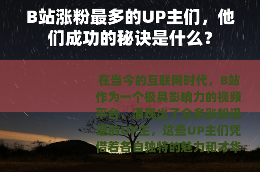 在当今的互联网时代,B站作为一个极具影响力的视频平台,涌现出了众多涨粉迅速的UP主,这些UP主们凭借着各自独特的魅力和才华,吸引了大量粉丝的关注,成为了B站上的热门人物。