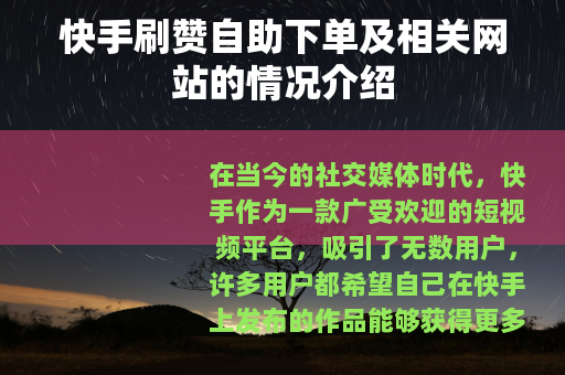 在当今的社交媒体时代,快手作为一款广受欢迎的短视频平台,吸引了无数用户,许多用户都希望自己在快手上发布的作品能够获得更多的点赞,从而提高作品的曝光度和影响力,在这样的需求下,快手刷赞自助下单以及一些快手刷赞网站应运而生。