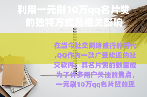 在当今社交网络盛行的时代,QQ作为一款广受欢迎的社交软件,其名片赞的数量成为了许多用户关注的焦点,一元刷10万qq名片赞的现象逐渐兴起,吸引了不少人的目光。