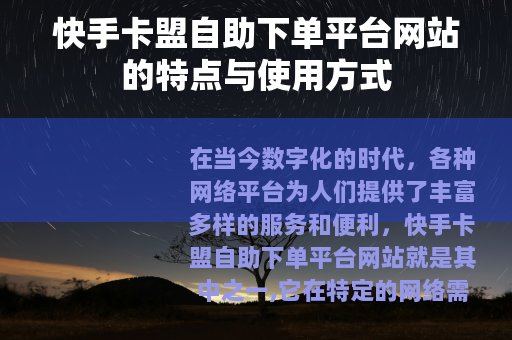 在当今数字化的时代,各种网络平台为人们提供了丰富多样的服务和便利,快手卡盟自助下单平台网站就是其中之一,它在特定的网络需求领域中有着独特的地位和作用。