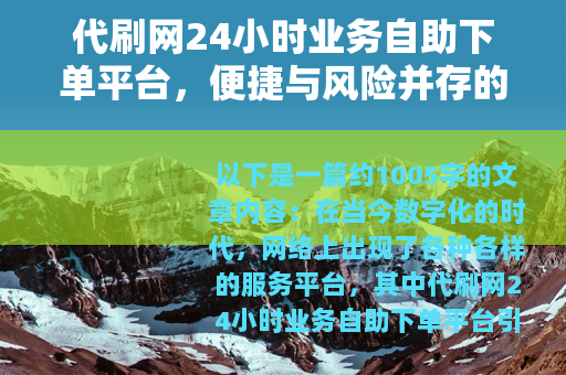 在当今数字化的时代,网络上出现了各种各样的服务平台,其中代刷网24小时业务自助下单平台引起了不少人的关注,这些平台声称能够为用户提供一系列的便捷服务,满足用户在不同领域的需求。