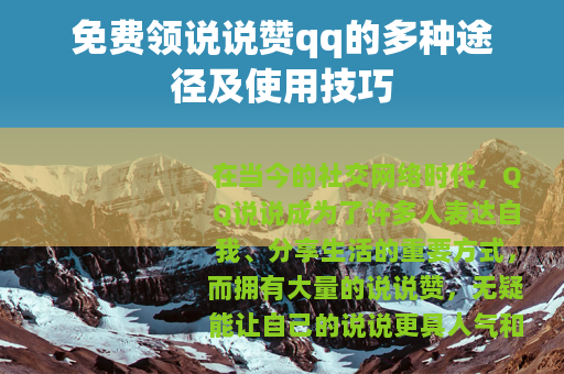 在当今的社交网络时代,QQ说说成为了许多人表达自我、分享生活的重要方式,而拥有大量的说说赞,无疑能让自己的说说更具人气和影响力,免费领说说赞qq的方法受到了不少人的关注。