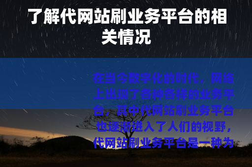 在当今数字化的时代,网络上出现了各种各样的业务平台,其中代网站刷业务平台也逐渐进入了人们的视野,代网站刷业务平台是一种为网站提供特定数据提升服务的平台,它在一定程度上满足了部分网站运营者对于数据增长的需求。