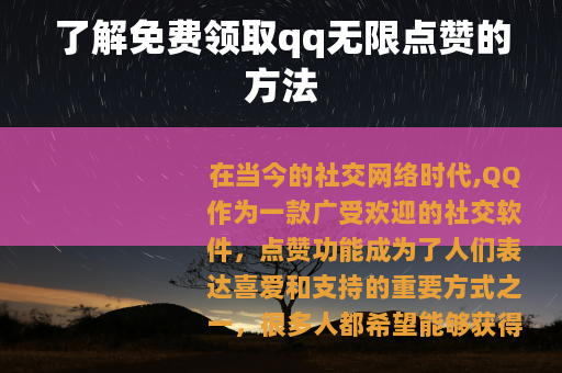 免费领取qq无限点赞并非遥不可及的梦想,只要我们通过合法合规的方式,积极参与QQ的各种活动,不断优化自己的空间内容,加强与好友的互动,就能够逐步增加自己的点赞数量,让自己在QQ社交圈中更加活跃和受欢迎,通过这些努力,我们可以在享受社交乐趣的同时,也收获更多的点赞和认可,让自己的QQ空间成为一个充满活力和人气的社交天地。