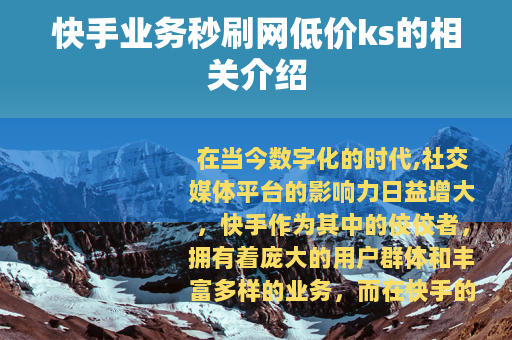 在当今数字化的时代,社交媒体平台的影响力日益增大,快手作为其中的佼佼者,拥有着庞大的用户群体和丰富多样的业务,而在快手的众多业务中,有一种现象备受关注,那就是快手业务秒刷网低价ks。