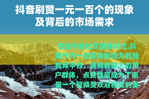 在当今的社交媒体时代,抖音作为一款极具影响力的短视频平台,拥有着庞大的用户群体,点赞数量成为了衡量一个视频受欢迎程度的重要指标之一,而在这样的背景下,出现了一种所谓“刷赞抖音一元一百个”的现象。
