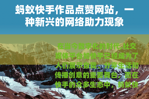 在当今数字化的时代,社交媒体平台如快手已经成为了人们展示自我、分享生活和传播创意的重要舞台,而在快手的众多生态中,蚂蚁快手作品点赞网站也悄然兴起,成为了一个备受关注的话题。