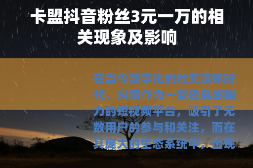 在当今数字化的社交媒体时代,抖音作为一款极具影响力的短视频平台,吸引了无数用户的参与和关注,而在其庞大的生态系统中,出现了一种备受瞩目的现象——卡盟抖音粉丝3元一万。